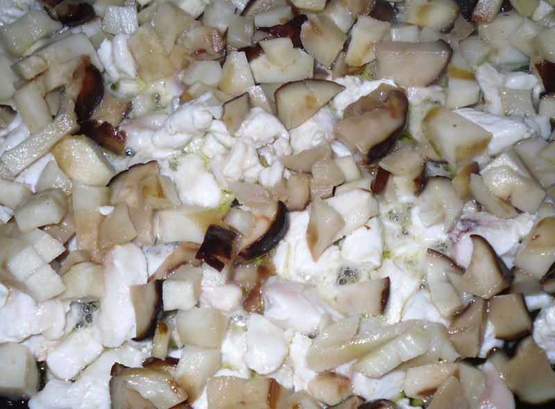 agregamos los trocitos de pollo y, a continuación, los cuadraditos de porros.